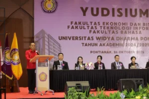 BERIKABARNEWS l PONTIANAK – Wakil Gubernur Kalbar, Krisantus Kurniawan menghadiri yudisium Universitas Widya Dharma Pontianak di Qubu Resort, Minggu (26/10) malam. Krisantus yang hadir untuk memberikan pesan khusus di depan ratusan mahasiswa yang akan di wisuda Senin (27/10).